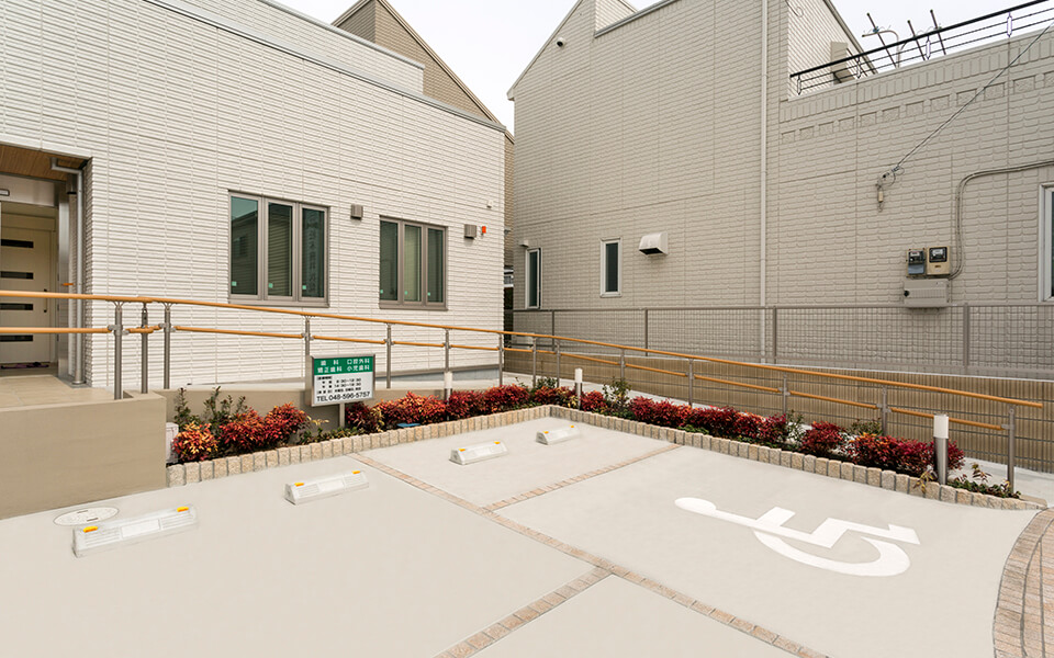 当院では障がい者専用駐車スペースを設けています。駐車場から入口までスロープと手すりがあり、院内も全てバリアフリー設計です。多目的トイレは、車いすの方に安心して利用して頂けるようにスペースを広くとり、専用の手すりを設置しています。また、看護師が常駐していますので、介助が必要な方はお申し付け下さい。